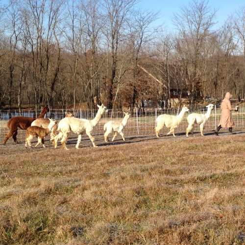 Warm Suri alpacas following Jennifer on a cold Kentucky winter day!